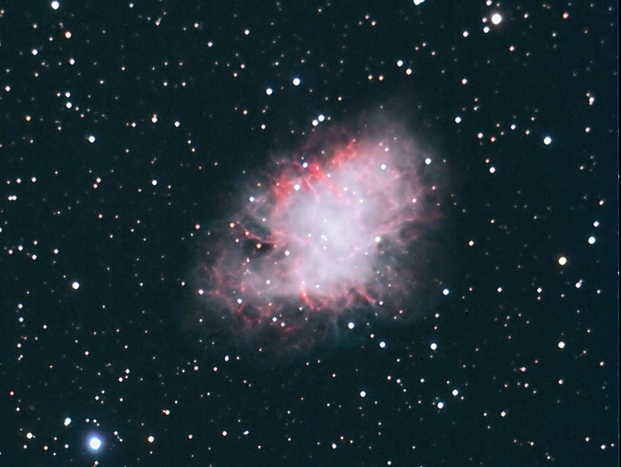 撮影日時: 11/17 気温:-4℃ (しらびそ) 撮影機材: C11 (fl 2800mm F10) EOS Kiss Digital X 改 (EO400D) RF1 FFフィルター: HEUIB-FF 赤道儀: New Atlux ガイド: 自作オフアキシス ST-402ME 感度: ISO 1600 露光: 600sec データ形式:RAW WB: AUTO TIME: 22:29 〜 23:51 ダークフレーム減算:RAP コンポジット数: 8枚 周辺のガスにこだわって処理した、ゆで過ぎのカニです。 オフアキシスのお陰で10分露出も無難にこなせ(わずかにガイドエラーはありますが)、長い回り道から定石の道に入ってしまいました。 ちょっと残念ですが、何を思ったのか重厚長大路線の長焦点を始めたものですから致し方なしです。 まぁ、オフアキシスを自作したのがせめてもの慰めです。 このオフアキシスは光路長がEOSマウントから2インチバレル付け根まで24mmという短いもので スペースの制約が厳しくて未だにゴソゴソ作り変えています。 落ち着いたらお見せしたいと思っています。 ![]() オリジナル 1枚(ダーク処理なし) |