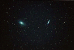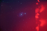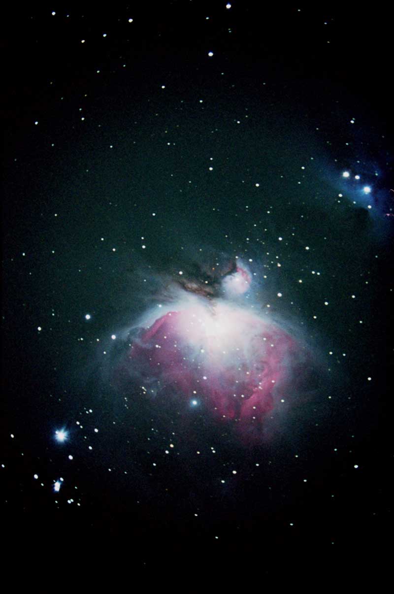 | かぶりがひどいのと周辺減光で オリオン上の青い星雲?が写りません。 まるで鍵穴の風景になってしまいました。 粒子か処理の影響か画像の荒れがあります。 ISO800はこんなものか? 北のM51はかぶりが少なかったのですが ガイドエラーで表紙を飾れません。 |