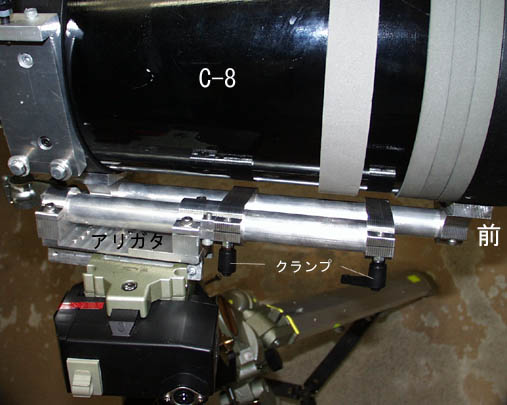 C−8側とアリガタ側にそれぞれ25φジュラルミン丸棒を取付け、2箇所のクランプで固定します。