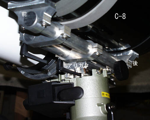 赤経軸と極軸望遠鏡の締め付け部に薄い金属板を挟んで軸合わせしました。 |